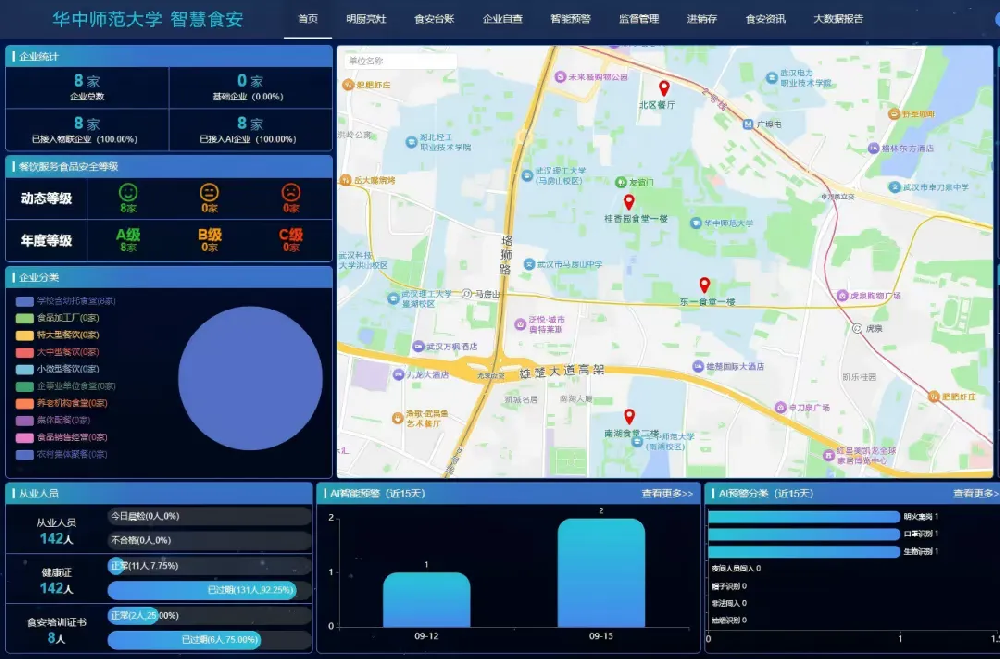 当学校的后勤处长通过手机大屏实时查看全校能耗曲线;当食堂厨师根据系统生成的精准订单准备食材;当维修师傅按照智能调度的最优路径前往报修点;......这些场景正在勾勒教育后勤数字化变革的全新图景。来源网络,侵权删智慧食安全链条可追溯的“透明厨房”华中师范大学实施“互联网+明厨亮灶”工程,实现全校食堂后厨视频监