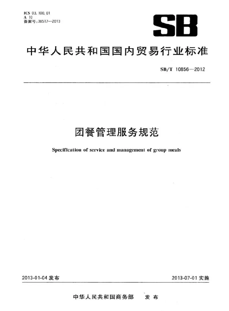 2013年1月,中国团餐行业标准SB/T 10856-2012《团餐管理服务规范》,由商务部正式发布,并于同年7月实施。2025年6月,商务部发布SB/T 10856-2025《团餐操作服务规范》,此规范为SB/T 10856-2012《团餐管理服务规范》的修订版本,将于2026年1月1日正式实施。此次修订新增了清洁维护与废弃物管理、有害生物防制、人员管理、节